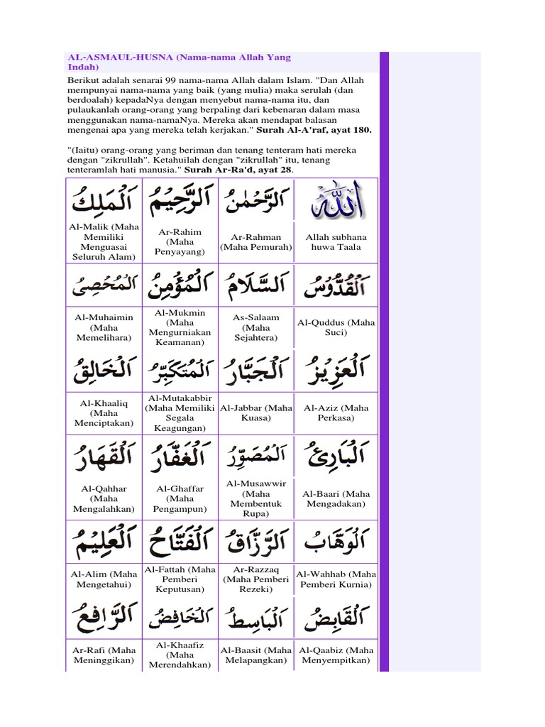 Mengingat hikmah dibalik baiknya membaca asmaul husna, secara tidak langsung dengan membaca, menghafal dan mengetahui arti dari setiap asmaul husna tersebut dapat meningkatkan keimanan. Disini saya izasahkan surat agar ibu mudah dlam melahirkan bismilahi rohman nirohim bismilahi ladzi laya duruhuma asmihi syaiun filardi wala fisamai. Asmaul husna, arti, keutamaan dan cara mengamalkannya.docx. Di pertengahan video asmaul husna ini insya allah kita akan membahas satu persatu asmaul husna dan artinya. Please copy and paste this embed script to where you want to embed. Leave a comment go to comments. Buku sistem negara khilafah dalam syariah islam pdf. It is compatible with all android devices (required android 4.0+) and can also be able to install on pc & mac, you might need an android emulator such as bluestacks, andy os, koplayer, nox app player Asmaul husna ketujuh ini juga ada pada surat al hasyr ayat 23. Apabila berdzikir dengan menyebut nama allah sebanyak 500 kali setiap malam, apalagi setelah melakukan salah sunat 2 rakaat atau tahajud, memiliki pengaruh yang besar untuk mencapai segala sesuatu yang diniatkan. Please fill this form, we will try to respond as soon as possible. Kumpulan doa bacaan dzikir asmaul husna. Sifat allah ini sangat baik diucapkan ketika manusia memohon doa kepada allah.